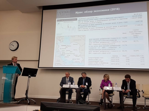 Далее с докладом от Аналитического центра выступил Кирилл Мурадов, Заместитель директора Информационно-аналитического центра по вопросам внешнеторговой деятельности. В своем выступлении Кирилл Юрьевич рассказал о методике для оценки целесообразности участия России в создании промышленных зон за рубежом, показал основные модели определения перспективных видов обрабатывающих производств, а также представил обзор промышленности Сербии и Ирана и динамику изменения экономических показателей с 2005 по 2016 годы.