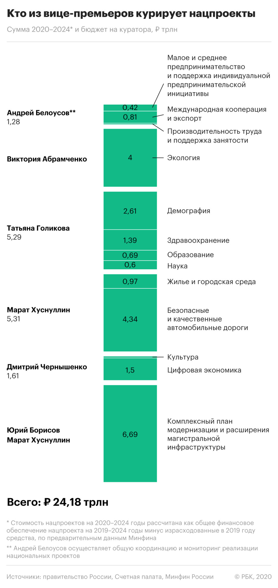 Кураторами нацпроектов стали шесть вице-премьеров из девяти. Белоусов как первый зампред осуществляет общую координацию и мониторинг реализации нацпроектов. Общий бюджет всех нацпроектов в 2020–2024 годах составляет почти 24,2 трлн руб. Кроме того, Белоусов, как и Силуанов ранее, курирует три нацпроекта: «Малое и среднее предпринимательство», «Международная кооперация и экспорт» и «Производительность труда и поддержка занятости». Их совокупный бюджет на пятилетку — около 1,3 трлн руб.