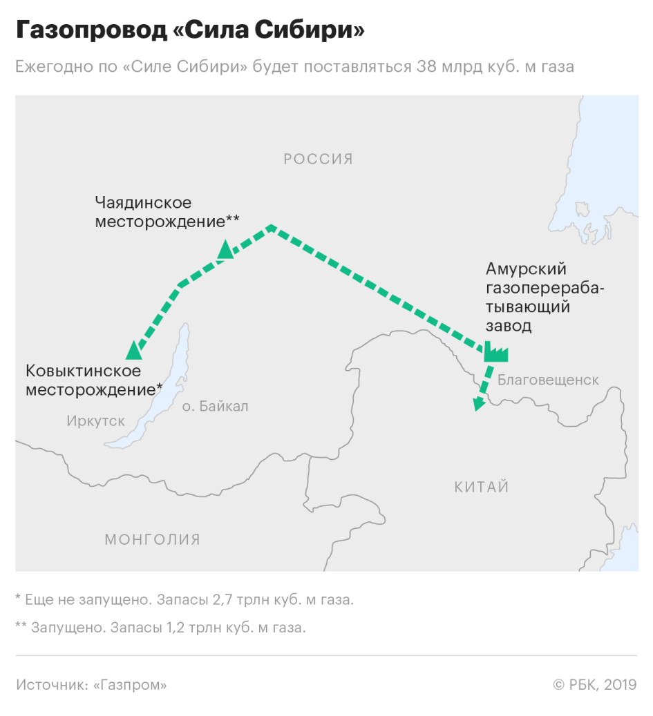 Протяженность «Силы Сибири» составляет около 3 тыс. км, на проект потратили 1,1 трлн руб. В понедельник состоялся запуск участка протяженностью около 2,2 тыс. км от Чаяндинского месторождения в Якутии до Благовещенска (граница с Китаем). На втором этапе будет запущен еще один участок, длиной около 800 км, от Ковыктинского месторождения до Чаяндинского.