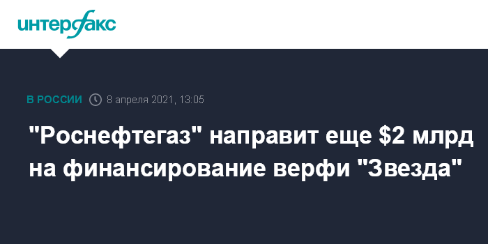 Москва. 8 апреля. INTERFAX.RU - Госхолдинг "Роснефтегаз" вложит в строительство суперверфи на Дальнем Востоке еще порядка $2 млрд, говорится в его отчете. Летом 2020 года сообщалось, что холдинг направит на эти цели $1,4 млрд (100 млрд рублей).