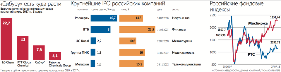 Если в ходе сделки удастся привлечь указанную сумму, IPO «Сибура» станет одним из крупнейших в российской истории. Рекорд принадлежит «Роснефти» – $10,7 млрд в 2006 г. За ней следуют ВТБ ($8 млрд, 2007 г.) и UC Rusal ($2,2 млрд, 2010 г.).