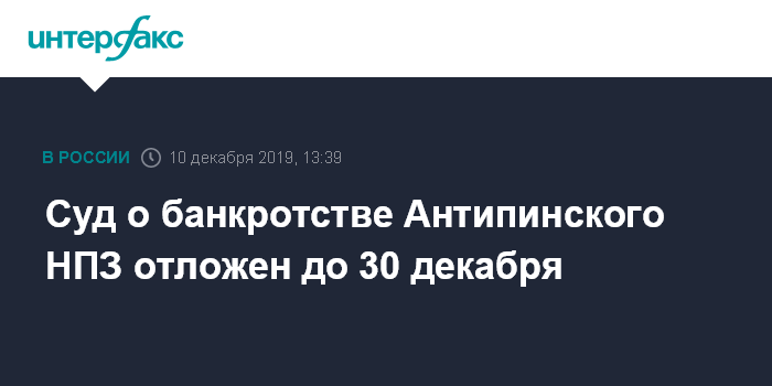 Москва. 10 декабря. INTERFAX.RU - Арбитражный суд Тюменской области отложил на 30 декабря рассмотрение иска о банкротстве Антипинского нефтеперерабатывающего завода. Перенос заседания связан с тем, что до сих пор не прошли собрания кредиторов.