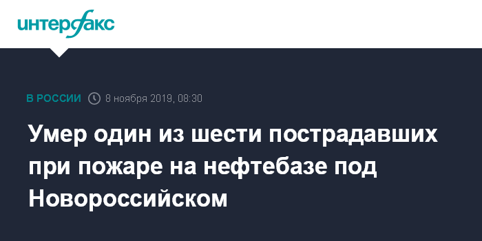 Москва. 8 ноября. INTERFAX.RU - В Новороссийске умер один из шести пострадавших при пожаре на нефтеперевалочной базе "Грушовая" компании "Черномортранснефть". Об этом сообщил представитель Минздрава Краснодарского края.