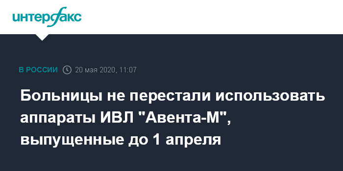 Москва. 20 мая. INTERFAX.RU - Российские и иностранные больницы продолжают использовать аппараты ИВЛ "Авента-М", произведенные до 1 апреля, сообщили в концерне "Радиоэлектронные технологии" (КРЭТ). Ранее Росздравнадзор приостановил использование приборов, выпущенных с 1 апреля, после двух пожаров и гибели пациентов.