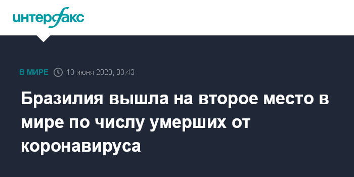 Москва. 13 июня. INTERFAX.RU - Жертвами коронавирусной инфекции в Бразилии стали 41 828 человек, занимавшая ранее вторую строчку Великобритания с 41 566 умершими от COVID-19 опустилась на третье место, свидетельствуют данные университета Джонса Хопкинса.