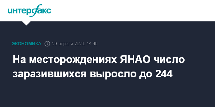 Москва. 29 апреля. INTERFAX.RU - На месторождениях Ямало-Ненецкого автономного округа за сутки было выявлено 16 новых случаев заражения коронавирусом, всего их стало 244. Как сообщил региональный оперативный штаб, основной прирост дали предприятия в районе Нового Уренгоя.