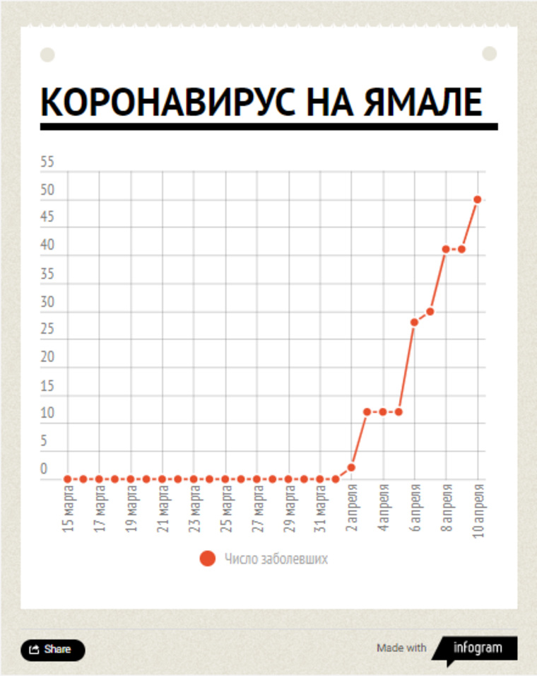 Сейчас самый северный уральский регион по числу заболевших вышел на второе место среди всех субъектов УрФО — на первом месте Свердловская область (61 случай). В ЯНАО также произошла первая смерть у пациента с диагнозом «коронавирус». Всего в России зарегистрирован 11 917 (+1 786) случай заболевания, 795 человек вылечилось, 94 человека умерло.