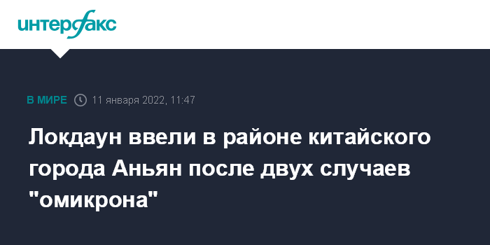 Москва. 11 января. Власти китайского городского округа Аньян (провинция Хэнань) объявили о введении локдауна в связи с обнаружением накануне двух случаев штамма "омикрон" коронавируса, сообщает во вторник агентство Associated Press (AP).