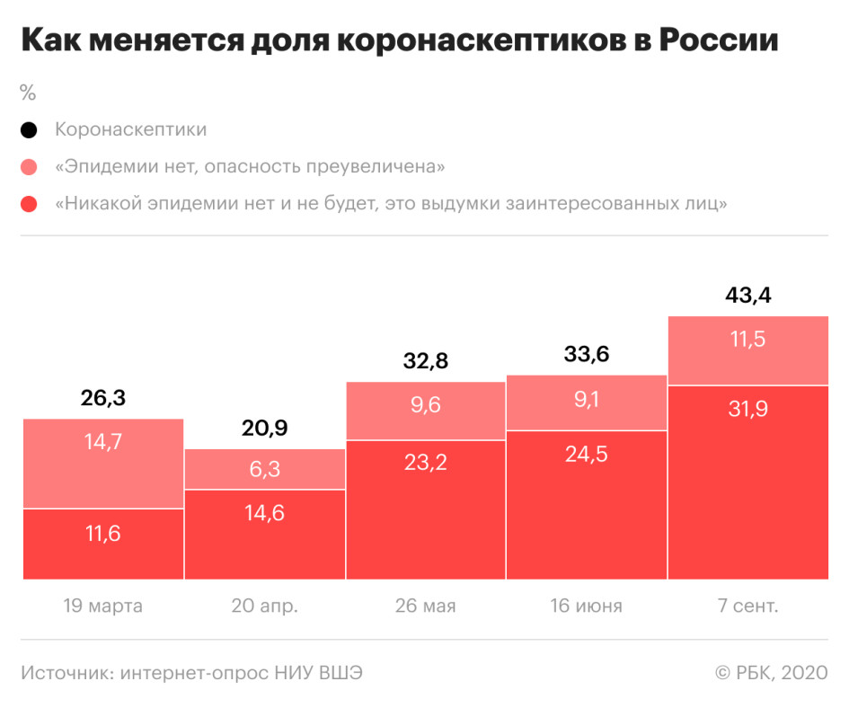 Согласно интернет-опросу НИУ ВШЭ, проведенному 5–7 сентября, 43,4% россиян оказались коронаскептиками. В их число входят те, кто считает, что никакой эпидемии нет (и что это выдумки заинтересованных лиц), и те, кто полагает, что опасность болезни преувеличена. 19 марта доля высказывавших такое мнение была значительно ниже — 26,3%. А минимум был отмечен в ходе опроса 20 апреля: тогда в опасности коронавируса и наличии эпидемии сомневались 20,9% респондентов.