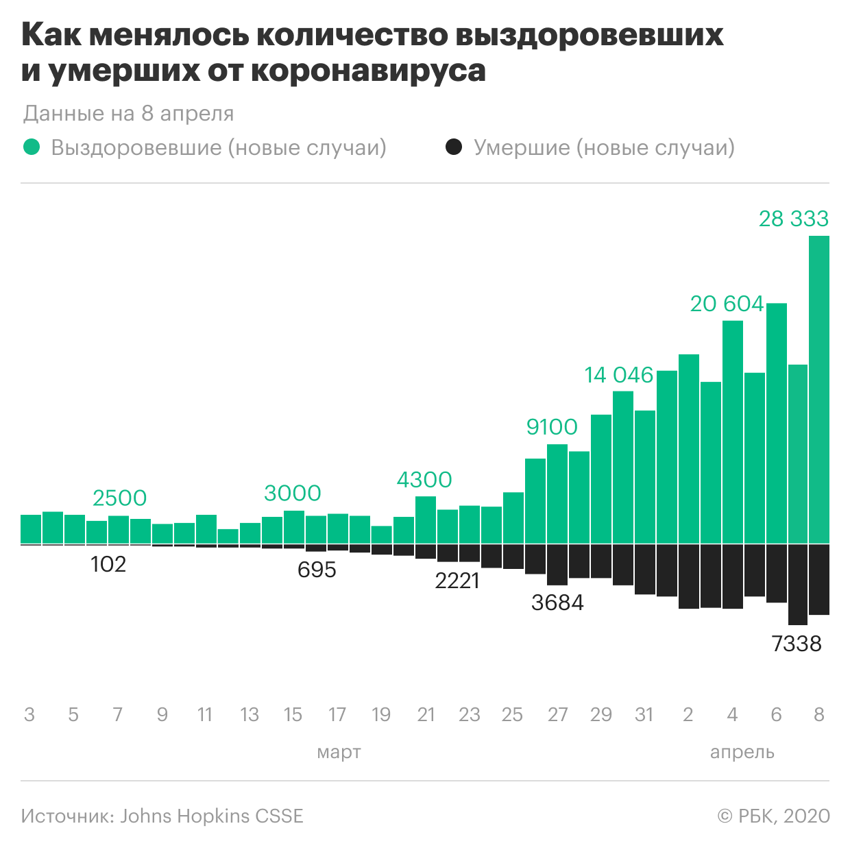 Всего в мире от коронавируса умерли, по данным Университета Джонса Хопкинса, 95 731 человек. Больше всего летальных исходов зафиксировано в Италии — 18 279. По данным ВОЗ, в мире от вируса скончались более 85,5 тыс. человек (6287 за сутки).
