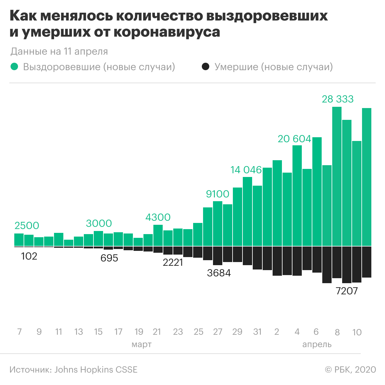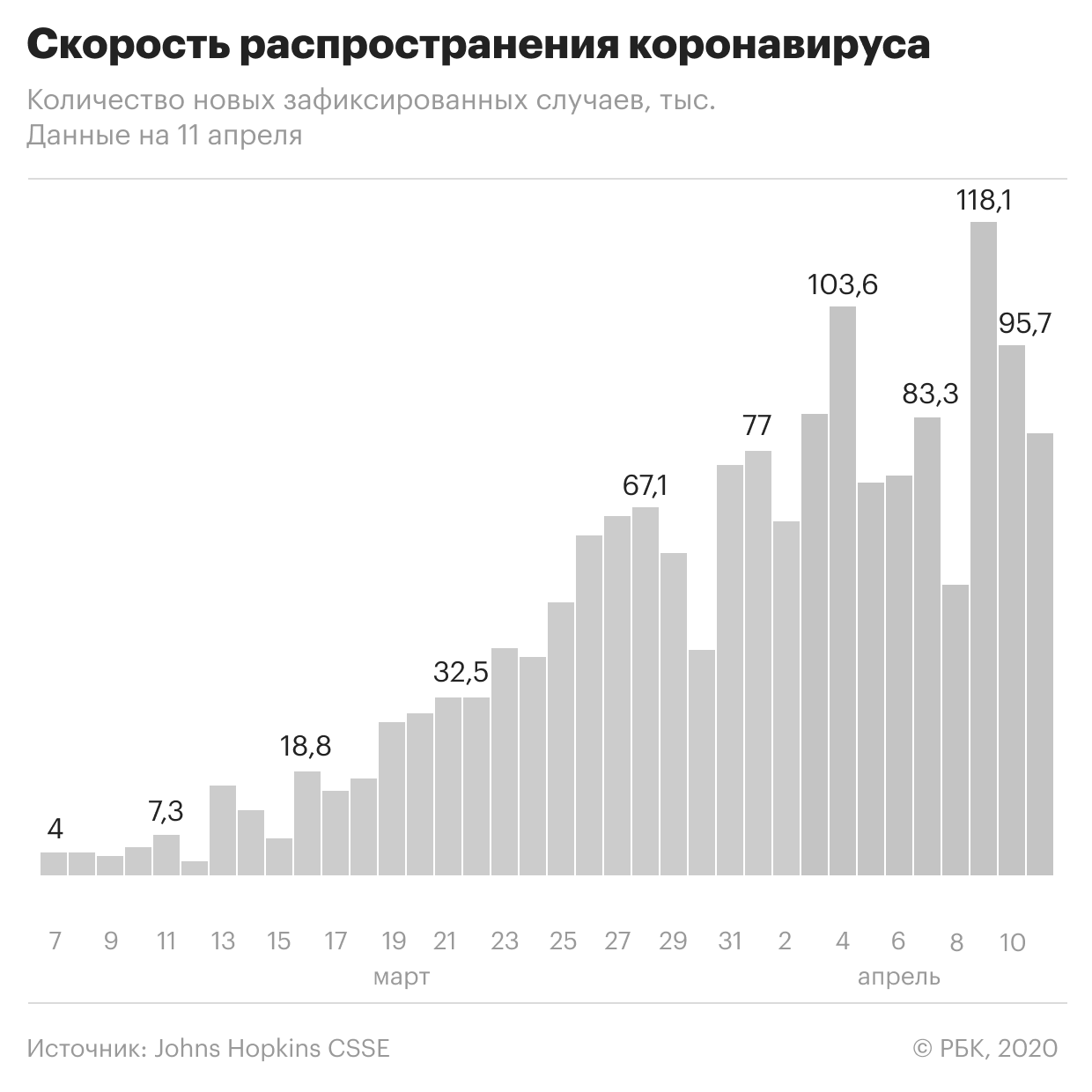 Лидером по числу подтвержденных случаев, по данным Университета Хопкинса, остаются США (557,5 тыс.). Испания находится на втором месте (166,8 тыс.), Италия — на третьем (156,3 тыс.), на четвертом — Франция (133,6 тыс.), Германия (127,8 тыс.) — на пятом.