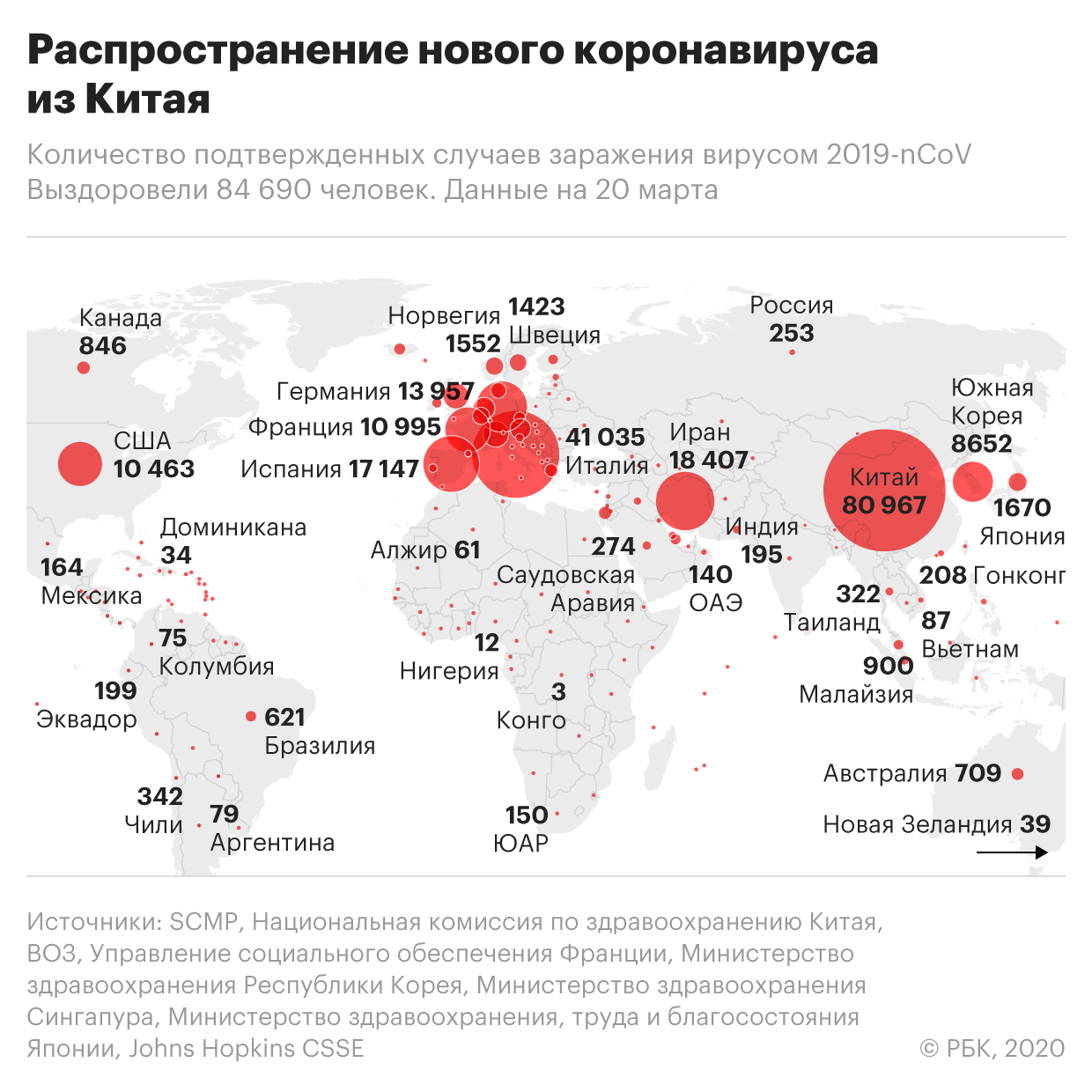 Лидером по количеству подтвержденных случаев, по данным SCMP, остается Китай (81 008, ВОЗ сообщает о 81 300 случаях), на втором месте — Италия (47 021, ВОЗ — 41 035), на третьем — Испания (19 980, ВОЗ — 17 147). Больше всего людей умерли от коронавируса в Италии (4032, ВОЗ — 3407), Китае (3255, ВОЗ — 3253) и Иране (1433, ВОЗ — 1284).