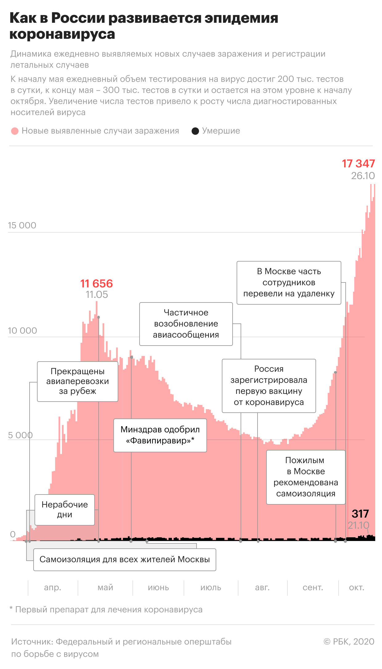 - Ситуация с коронавирусной инфекцией может стабилизироваться в России в первой декаде декабря. Фаза роста заболеваемости, по законом эпидемиологии, продолжается в среднем 2–2,5 инкубационного периода, который насчитывает 14 дней. О какой-либо стабилизации можно говорить к первой декаде декабря, считает заместитель директора по научной работе ЦНИИ эпидемиологии Роспотребнадзора Александр Горелов.