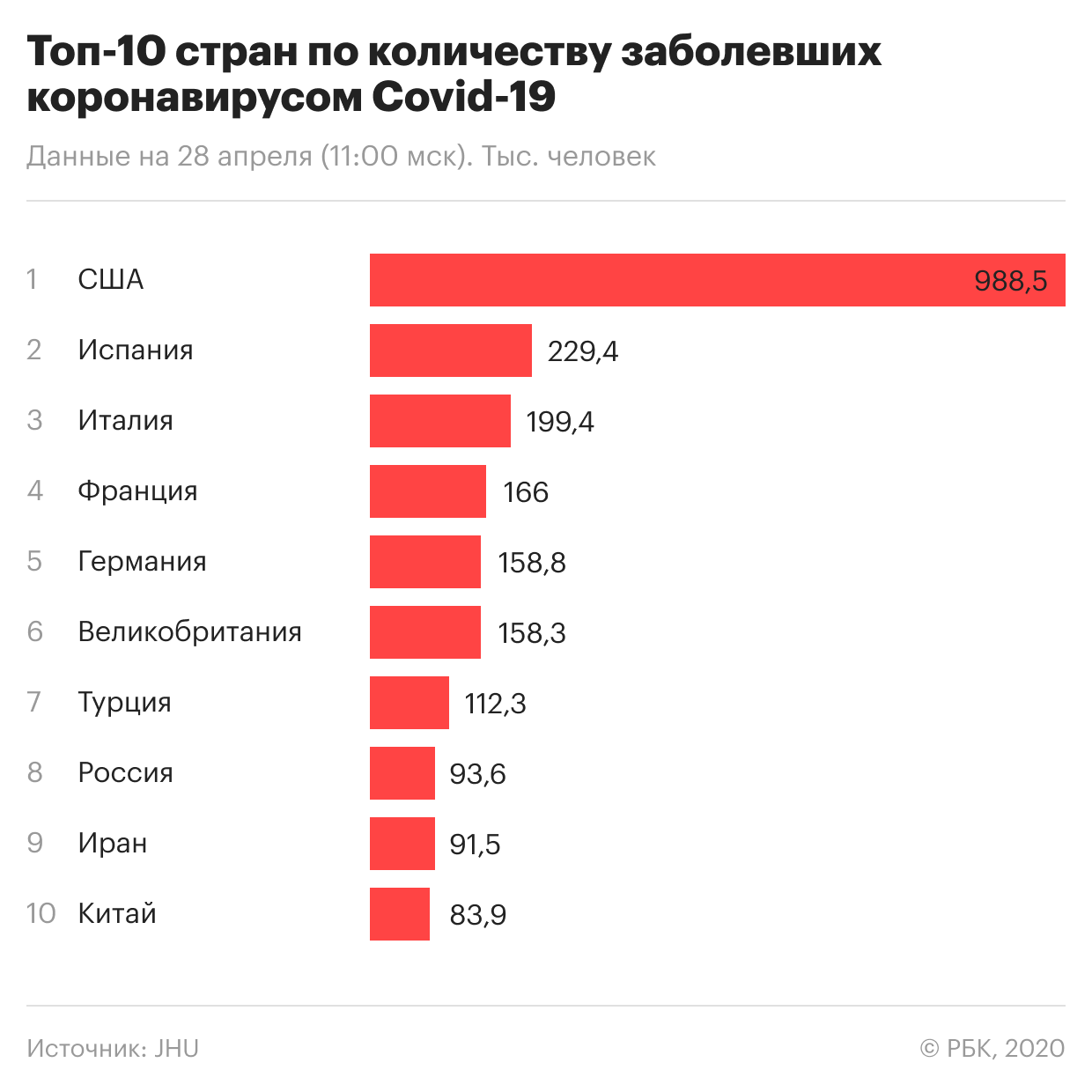 - Лидером по числу подтвержденных случаев, по данным Университета Хопкинса, остаются США, где количество зараженных превысило 1 млн человек. Испания находится на втором месте (232,1 тыс.), Италия — на третьем (201,5 тыс.), Франция — на четвертом (169 тыс.), Великобритания — на пятом (162,3 тыс.). Россия по числу заболевших вышла на восьмую строчку мирового рейтинга.