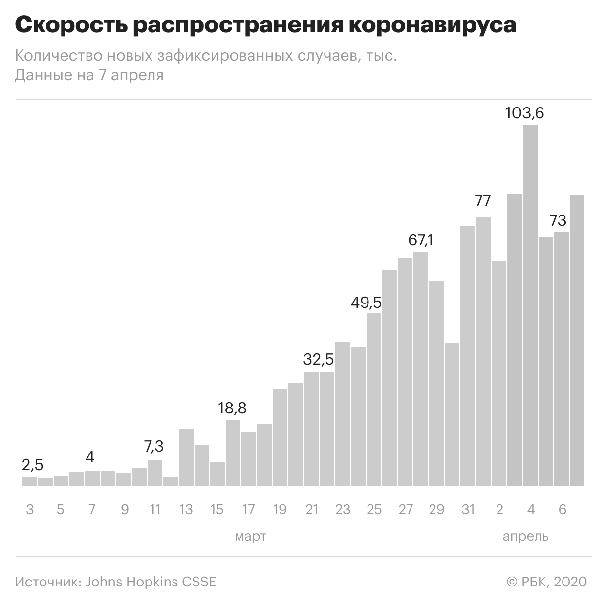 Лидером по числу подтвержденных случаев, по данным Университета Хопкинса, остаются США (432 тыс.). Испания находится на втором месте (148,2 тыс.), Италия — на третьем (139,4 тыс.), на четвертом — Германия (113,2 тыс.), Франция (83,08 тыс.) — на пятом. Китай, где началась пандемия, откатился на шестое место по числу случаев заражения (82 867, при этом 77,6 тыс. человек уже выздоровели).