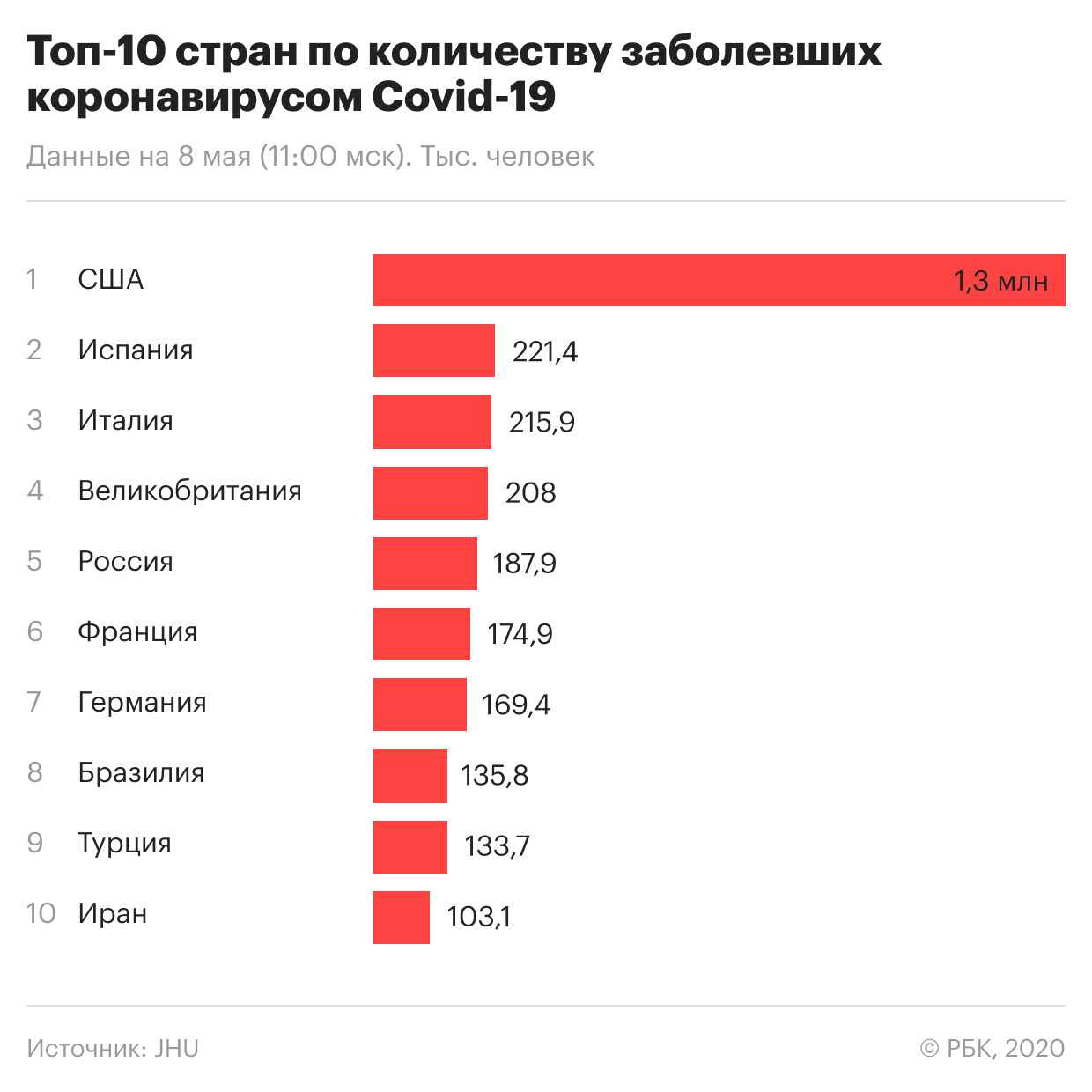 - Лидером по числу подтвержденных случаев, по данным Университета Джонса Хопкинса, остаются США, где количество выявленных зараженных превысило 1,283 млн человек. Испания находится на втором месте (222,8 тыс.), Италия — на третьем (217 тыс.), Великобритания — на четвертом (212,6 тыс.), Россия занимает пятую строчку (187,8 тыс.).