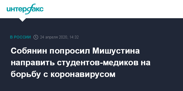 Москва. 24 апреля. INTERFAX.RU - Мэр Москвы Сергей Собянин попросил премьер-министра Михаила Мишустина подготовить приказ о том, что студенты 4-го и 5-го курсов медицинских вузов должны быть направлены на практику в больницы, где лечат заболевших коронавирусной инфекцией.