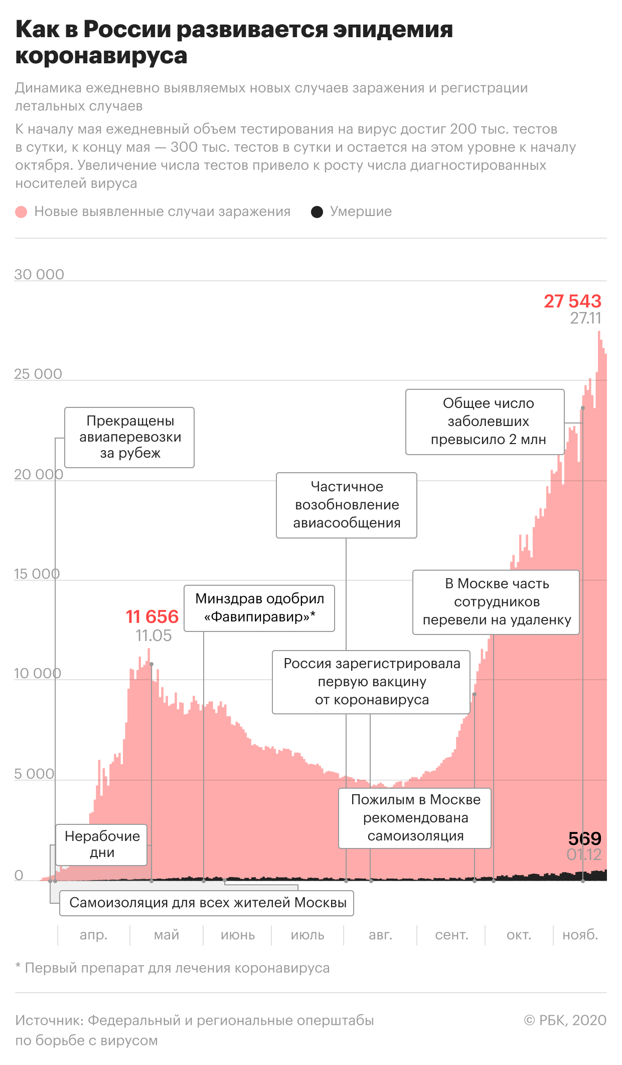 В России 1 декабря был зафиксирован максимум по числу смертельных случаев от коронавируса за сутки — от болезни умерли 569 человек. Общее число заболевших в стране достигло 2,3 млн, за минувшие сутки было подтверждено 26,4 тыс. новых случая.