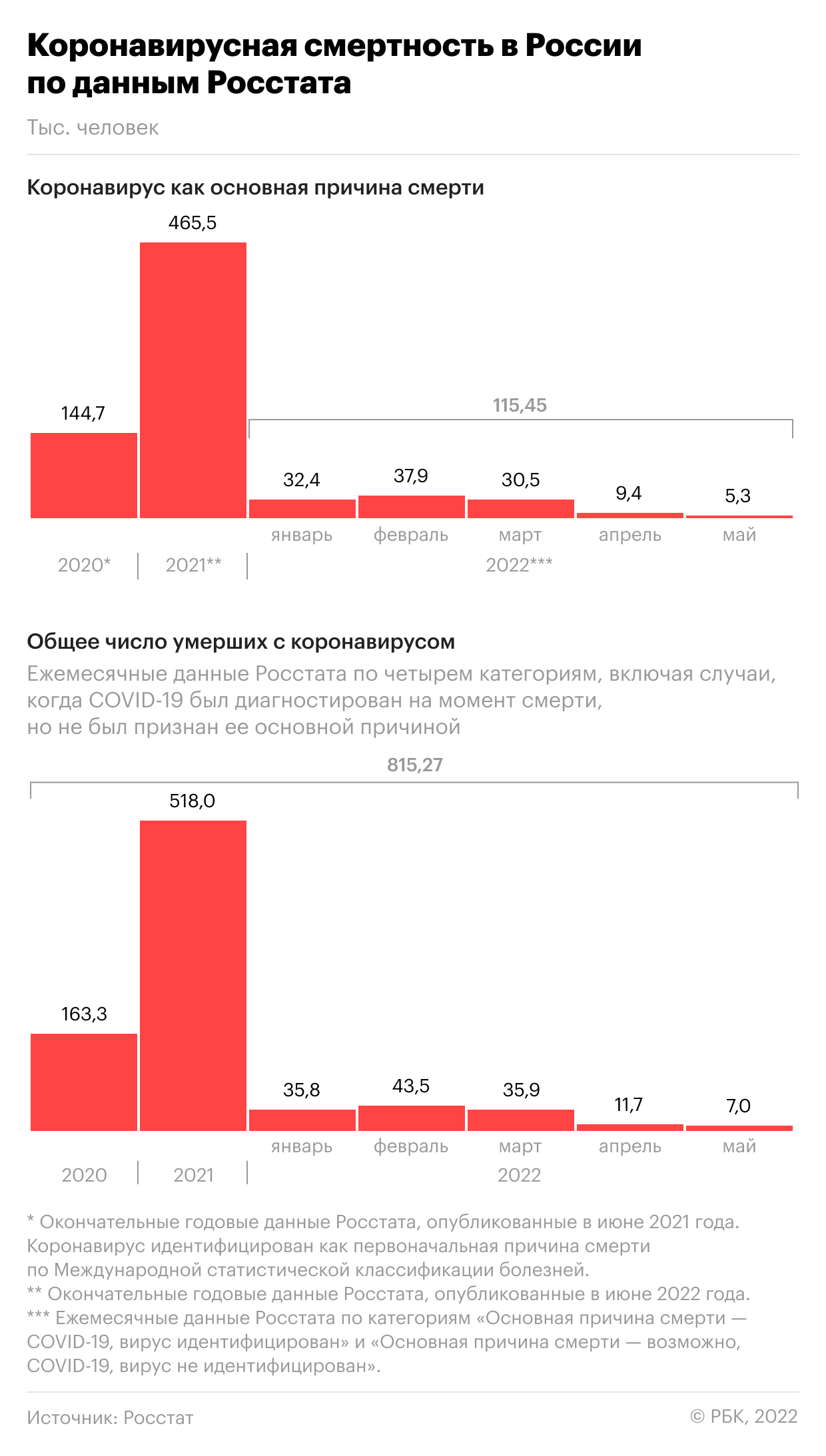 Всего с начала пандемии в России выявили 18,4 млн случаев заражения, выздоровели 17,9 млн человек, умерли, по данным оперштаба, 381 754 человека. По данным Росстата, учитывающего в том числе случаи, когда COVID не был основной причиной смерти, с начала пандемии скончались свыше 800 тыс. заболевших.