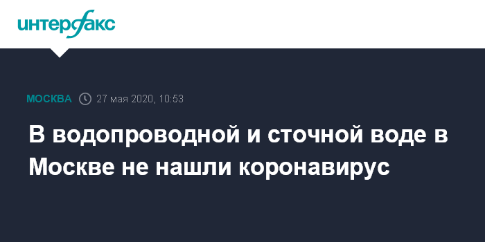 Москва. 27 мая. INTERFAX.RU - В ходе исследований водопроводной и сточной воды в Москве в ней не обнаружено содержания коронавируса, заявила начальник столичного управления Роспотребнадзора Елена Андреева на заседании Мосгордумы в среду.