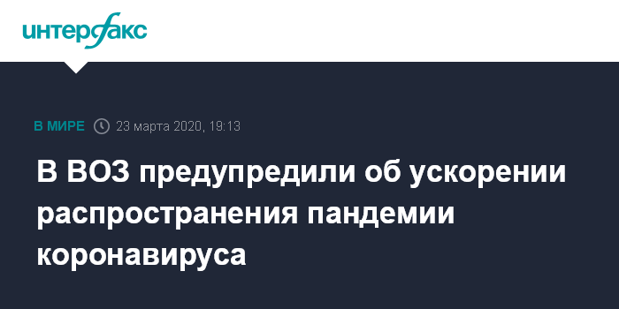 Москва. 23 марта. INTERFAX.RU - Темпы распространения коронавируса COVID-19 в мире ускоряются, сообщил гендиректор Всемирной организации здравоохранения (ВОЗ) Тедрос Адханом Гебрейесус.