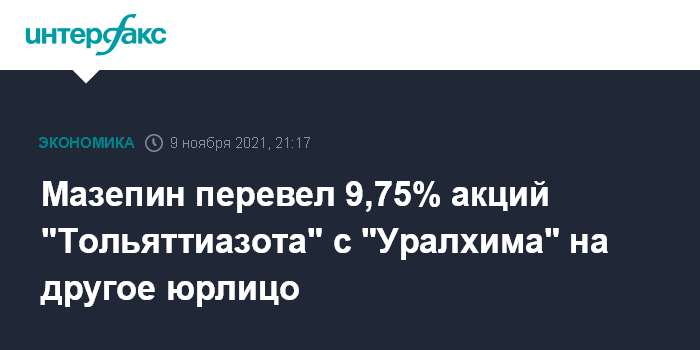 Москва. 9 ноября. АО "Химактивинвест" (Москва) сообщило, что стало владельцем 9,75% акций "Тольяттиазота". Доля подконтрольной Дмитрию Мазепину АО "ОХК "Уралхим" в "Тольяттиазоте" снизилась с 9,98% до 0,23%.