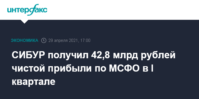 Москва. 29 апреля. INTERFAX.RU - "СИБУР" в первом квартале получил 42,8 млрд рублей чистой прибыли по МСФО против убытка в 52 млрд рублей годом ранее, говорится в отчете компании.