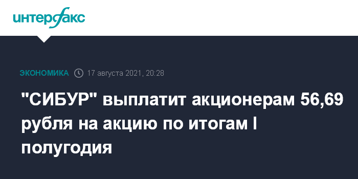 Москва. 17 августа. INTERFAX.RU - Совет директоров "СИБУРа" предлагает направить на выплату дивидендов по результатам первого полугодия 2021 года 56,69 рубля на акцию, что составляет 123,5 млрд рублей, сообщила компания.