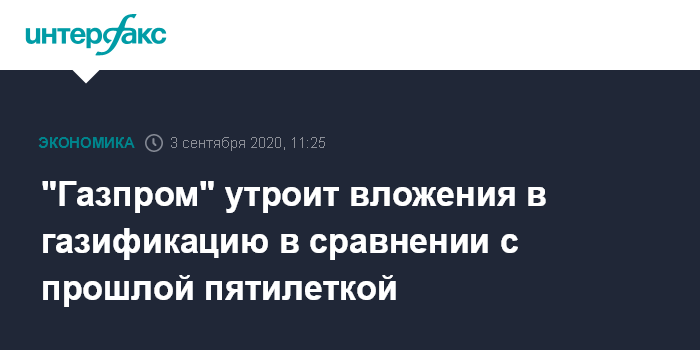 Москва. 3 сентября. INTERFAX.RU - Инвестиции "Газпрома" в газификацию регионов России в 2021-2025 годах будут в три раза больше, чем в предыдущую пятилетку, сообщил председатель правления "Газпрома" Алексей Миллер на селекторе по случаю дня работника нефтяной и газовой промышленности.