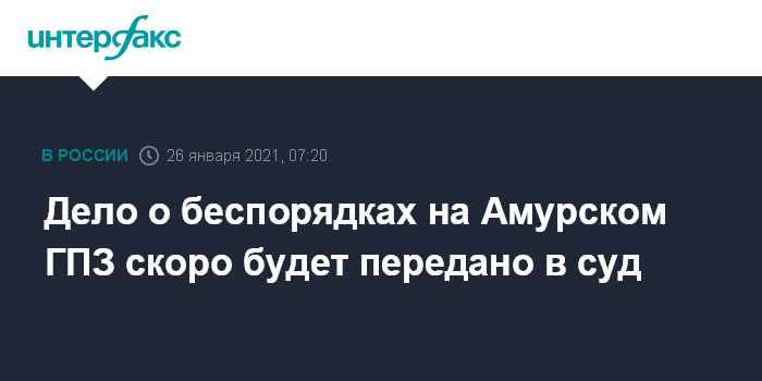 Москва. 26 января. INTERFAX.RU - Уголовное дело в отношении строителей Амурского газоперерабатывающего завода (ГПЗ, Амурская область), которые летом прошлого года устроили погром на территории вахтового городка, вскоре будет передано в суд, сообщил журналистам руководитель регионального следственного управления СК РФ Станислав Белянский.