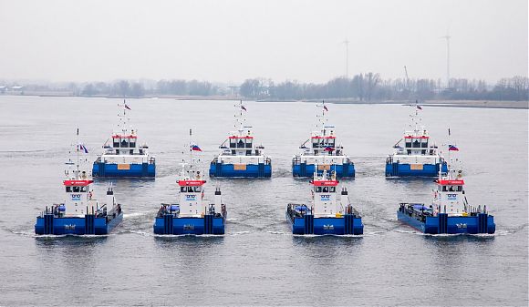 В сообщении группы отмечается, что для российского проекта были построены четыре многоцелевых буксирных судна Multi Cat 2608SD, четыре буксира-толкача серии Pusher Tugs 2612SD, семь понтонов Stan Pontoon 8916SD и четыре плавучих модуля Side Floater 8605SD.