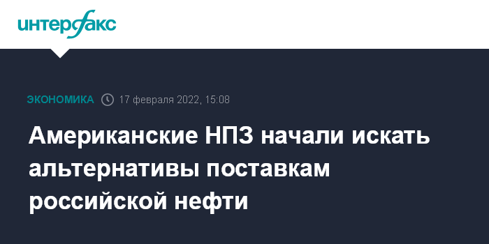 Москва. 17 февраля. Некоторые нефтеперерабатывающие заводы США начали искать альтернативы поставкам российской нефти на фоне роста геополитической напряженности в Восточной Европе, сообщает Bloomberg со ссылкой на информированные источники.