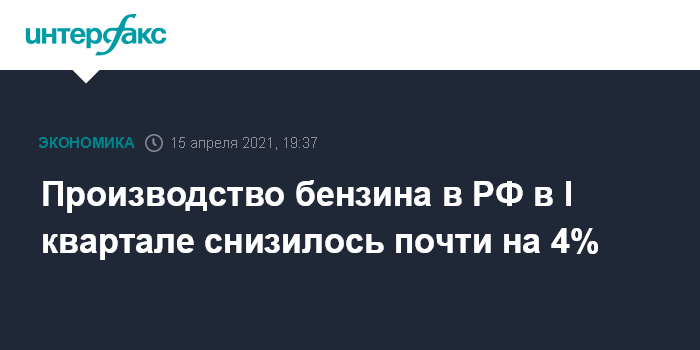 Москва. 15 апреля. INTERFAX.RU - Производство бензина в России в январе-марте 2021 года составило 9,9 млн тонн, что на 3,8% ниже января-марта 2020 года, сообщил Росстат.