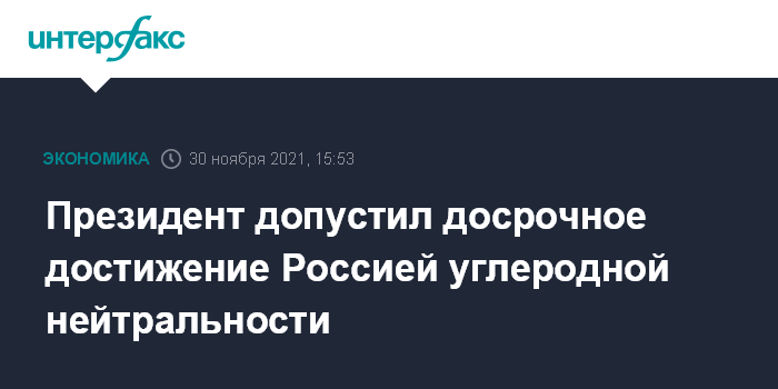Цель достичь углеродной нейтральности не позднее 2060 года зафиксирована в стратегии социально-экономического развития России с низким уровнем выбросов парниковых газов до 2050 года, которая была утверждена в начале ноября. В стратегии заложены два сценария - инерционный и целевой (интенсивный), который и устанавливает упомянутый президентом срок.