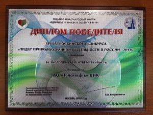 АО «Томскнефть» отмечено высшей наградой в номинации «За экологическую ответственность» XIV всероссийского конкурса «Лидер природоохранной деятельности в России-2018». Награждение прошло в Москве в рамках VII международного форума «Здоровье человека и экология-2018».
