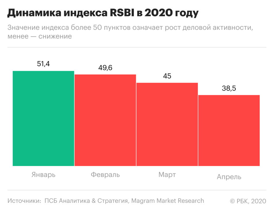 Индекс деловой активности малого и среднего бизнеса RSBI в апреле продемонстрировал резкое снижение, достигнув минимальной отметки за всю историю наблюдений, следует из результатов ежемесячного опроса предпринимателей, который проводят Промсвязьбанк, «Опора России» и агентство Magram Market Research с третьего квартала 2014 года (исследование есть у РБК). Индекс опустился до отметки 38,5 пунктов с 45 пунктов в марте, что свидетельствует о существенном ухудшении деловой активности в секторе МСБ.