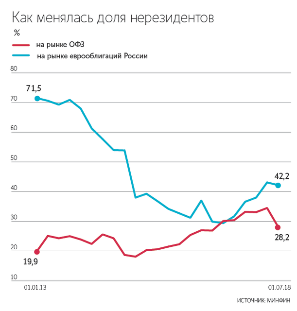 По данным ЦБ на 1 июля, нерезиденты держат 28,2% ОФЗ, это 1,982 трлн руб. Но в августе был отток и вряд ли у иностранных инвесторов осталось более 1,8 трлн руб., оценивает директор аналитического департамента «Локо-инвеста» Кирилл Тремасов и напоминает, что в этом году чистые заимствования Минфина – 1,044 трлн руб., а план на следующий – 1,475 трлн. Занять столько без нерезидентов очень сложно, говорит Тремасов, особенно если нерезиденты продолжат выходить из старых бумаг. Отток нерезидентов из ОФЗ начался в апреле, когда были введены санкции против UC Rusal, из-за них произошла и переоценка этого долга. Незаменимо участие нерезидентов в длинных бумагах (с погашением, например, в 2034 г.), считает Тремасов: в отдельных выпусках их доля доходит до 70%.