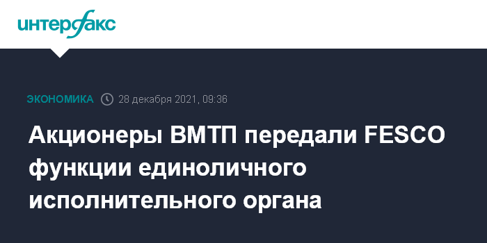 Москва. 28 декабря. Акционеры ПАО "Владивостокский морской торговый порт" (ВМТП, крупнейшая стивидорная компания в порту Владивосток, входит в группу FESCO) на внеочередном собрании решили передать полномочия единоличного исполнительного органа компании ООО "Транспортная группа ФЕСКО", говорится в сообщении стивидора.