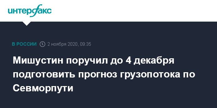 Москва. 2 ноября. INTERFAX.RU - Премьер-министр РФ Михаил Мишустин поручил профильным министерствам и другим структурам к 4 декабря представить прогноз грузопотока в акватории российской Арктической зоны и Северного морского пути на период до 2030 года и на перспективу до 2035 года.