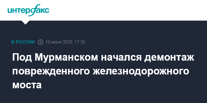 Москва. 10 июня. INTERFAX.RU - Специалисты в среду начали демонтаж железнодорожного моста между станциями Выходной и Кола под Мурманском, который обрушился 1 июня, сообщила пресс-служба Октябрьской железной дороги (региональный филиал ОАО "РЖД").