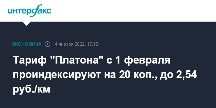 Москва. 14 января. Тариф госсистемы взимания платы с грузовиков массой более 12 тонн за проезд по федеральным автодорогам "Платон" с 1 февраля 2022 года будет проиндексирован на 20 копеек: с текущих 2,34 руб./км до 2,54 руб./км, сообщило Федеральное дорожное агентство (Росавтодор).