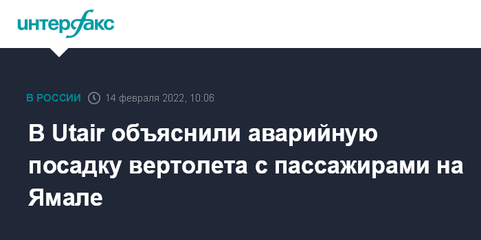 Москва. 14 февраля. Возможная неисправность несущего винта спровоцировала вынужденную посадку вертолета Ми-8 на Ямале, сообщили "Интерфаксу" в пресс-службе Utair.
