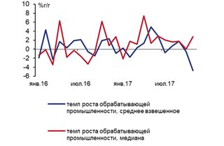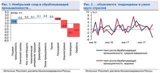 Оценка медианного темпа роста в обрабатывающей промышленности указывает на то, что спад производства в ноябре затронул ограниченный ряд отраслей и носит "локальный" характер, пишет министерство. В дополнение к официальным данным Росстата по промышленности Минэкономразвития оценило динамику обрабатывающих производств с использованием формулы медианы. "Данный подход позволяет сгладить искажающее влияние на совокупный показатель аномально высоких или низких темпов роста в отдельных отраслях. Оценка медианного темпа роста обрабатывающей промышленности за ноябрь составляет 2,8% г/г", - говорится в докладе.