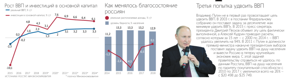 К 2024 г. Россия должна войти в пятерку крупнейших экономик мира по уровню ВВП на душу населения (по паритету покупательской способности), обогнав Германию. Именно такой является ключевая цель правительства избранного на четвертый срок президента Владимира Путина. Она обозначена в очередном майском указе президента, подписанном им 7 мая 2018 г. Ради ее достижения чиновники разработали 12 национальных проектов, на которые в течение 2019–2024 гг. будет потрачено 25,7 трлн руб. Чтобы найти на них деньги, власти повысили с 2019 г. НДС. Еще 500 млрд руб. в год они собираются занимать, выпуская облигации федерального займа для фонда развития. В целом половину финансирования обеспечит федеральный бюджет, 30% – внебюджетные источники и 20% – региональные бюджеты. Но обеспечат ли потраченные триллионы опережающий экономический рост?