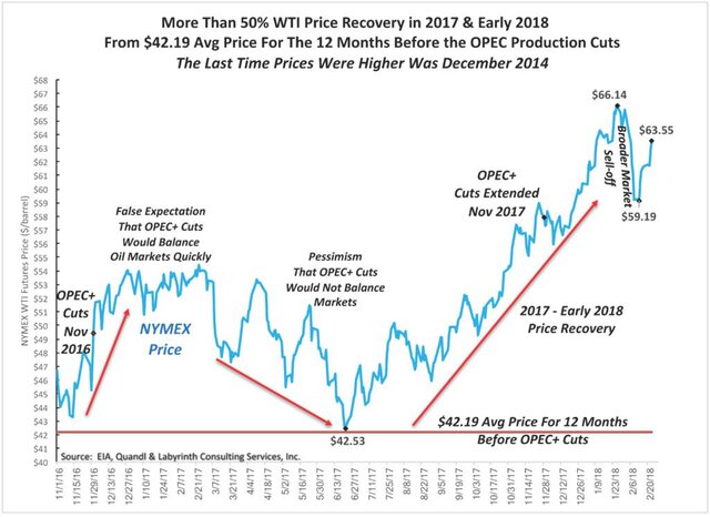 WTI в среднем составила около $42 за баррель за 12 месяцев до начала производственных сокращений ОПЕК+ в ноябре 2016 г. Цены сразу выросли до более чем $50 на фоне ложных ожиданий быстрой перебалансировки нефтяных рынков. К марту 2017 г. возникла обеспокоенность по поводу того, что сокращения не дадут нужного эффекта, а к июню цены упадут до уровня, отмеченного до начала сокращений.