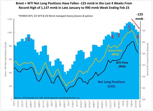 Длительные позиции хедж-фондов по нефти упали на 125 млн баррелей с рекордного максимума в конце января. Длинные позиции по-прежнему превосходят короткие позиции в 11 раз, но этот сдвиг является важным изменением в настроениях крупных поставщиков капитала, и это влияет на то, как нефтяные трейдеры воспринимают рынок.