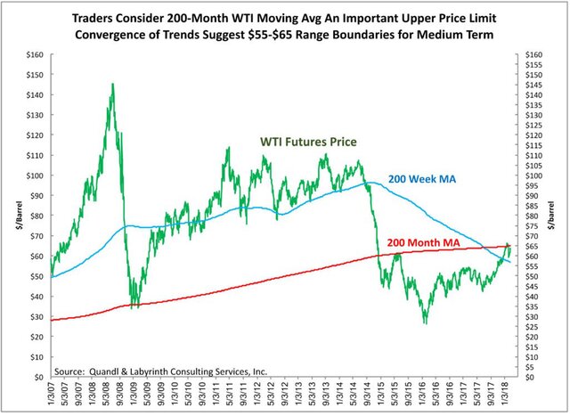 Конвергенция 200-месячной средней и других трендов предполагает, что границы диапазона находятся в районе от $55 до $65. Многие считают, что цены на нефть более склонны к снижению, нежели к росту.