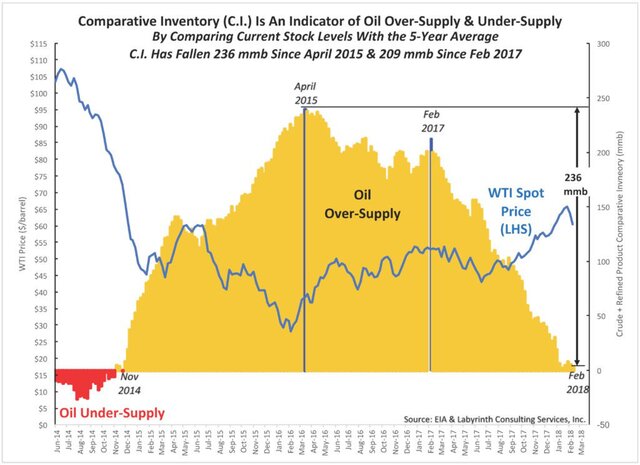 Это не означает, что цены не превысят $65 за баррель. Это означает, что $65 - это правильная цена в среднем за 5 лет. Если показатель сравнительных запасов становится все более негативным, цены должны расти.