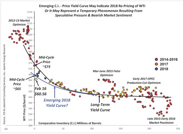 Эта новая кривая доходности предполагает, что средняя цена WTI может составлять $65 за баррель или ниже вместо более высокой цены, связанной с долгосрочной кривой.