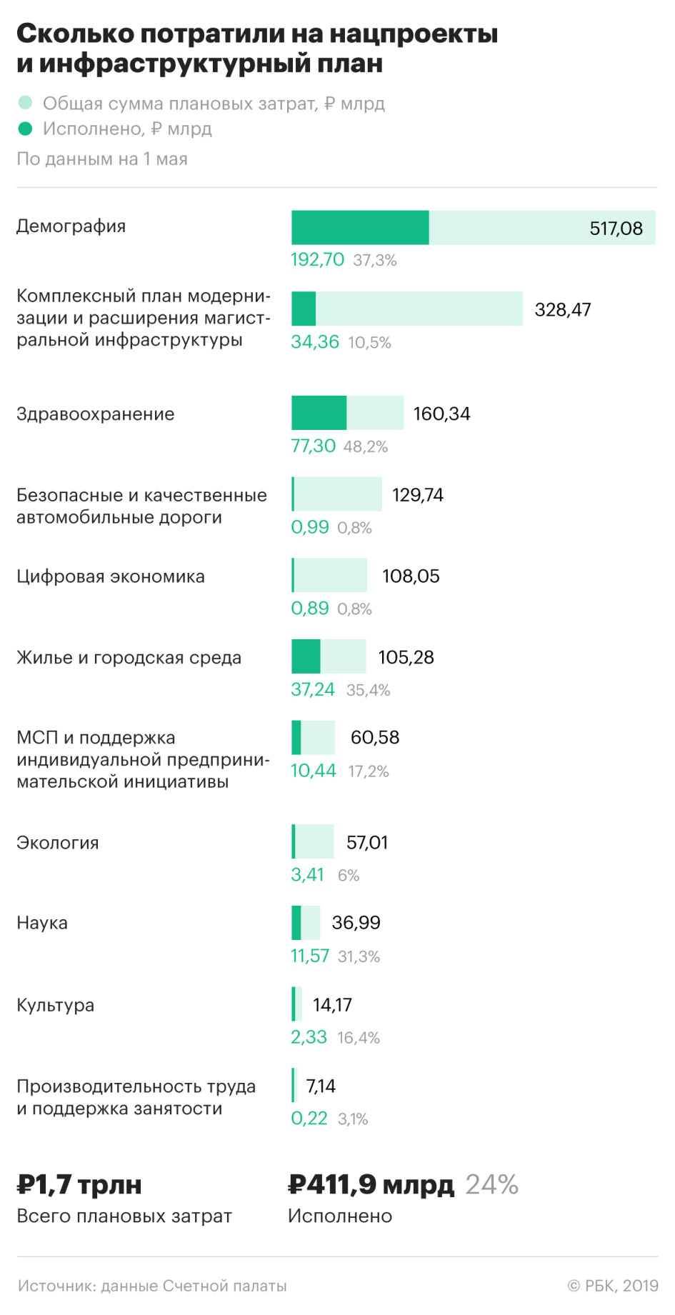 Счетная палата ведет ежемесячный оперативный контроль за каждым нацпроектом, сообщила РБК пресс-служба ведомства. Однако данные публикуются лишь раз в квартал, и на настоящий момент доступна информация лишь на 1 апреля. Вопрос об оперативном докладе об исполнении федерального бюджета, включая нацпроекты, за первое полугодие аудиторы рассмотрят в середине августа. «Материалы после их утверждения коллегией будут опубликованы на официальном сайте Счетной палаты», — заверили в ведомстве.